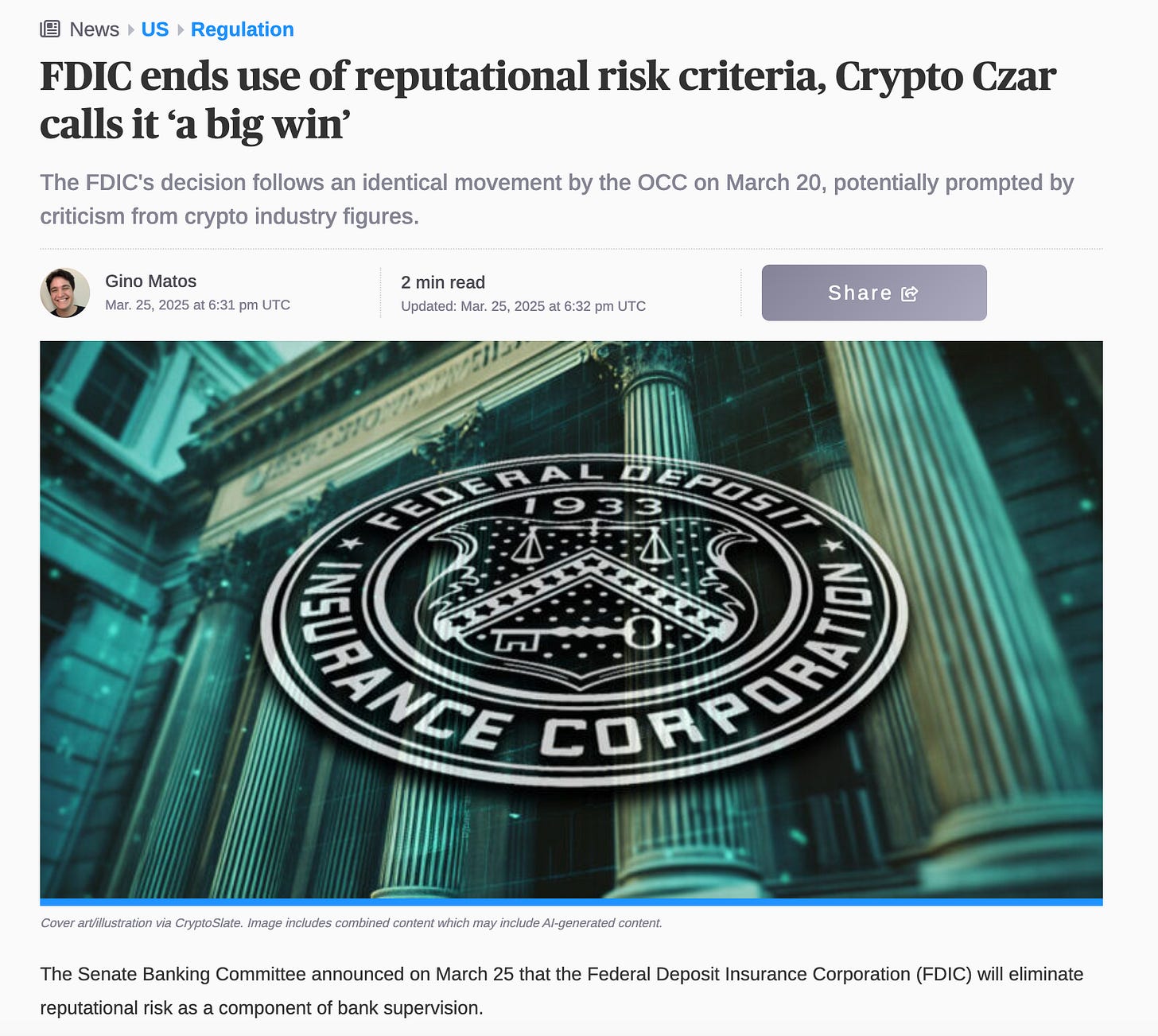 Matthew Sigel, head of digital assets research at VanEck, celebrated the FDIC’s decision as a “big win against Chokepoint 2.0.” He added that removing reputational risk means “fewer excuses to debank industries they don’t like.”